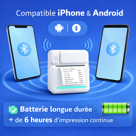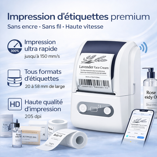 Découvrez nos imprimantes thermiques sans encre, économiques et écologiques. Compatibles avec plusieurs formats d’étiquettes, elles offrent une connexion Bluetooth et Wi-Fi pour une utilisation facile sur iPhone et Android. Batterie rechargeable USB-C et application mobile pour personnaliser vos étiquettes avec logos, QR codes et textes.
