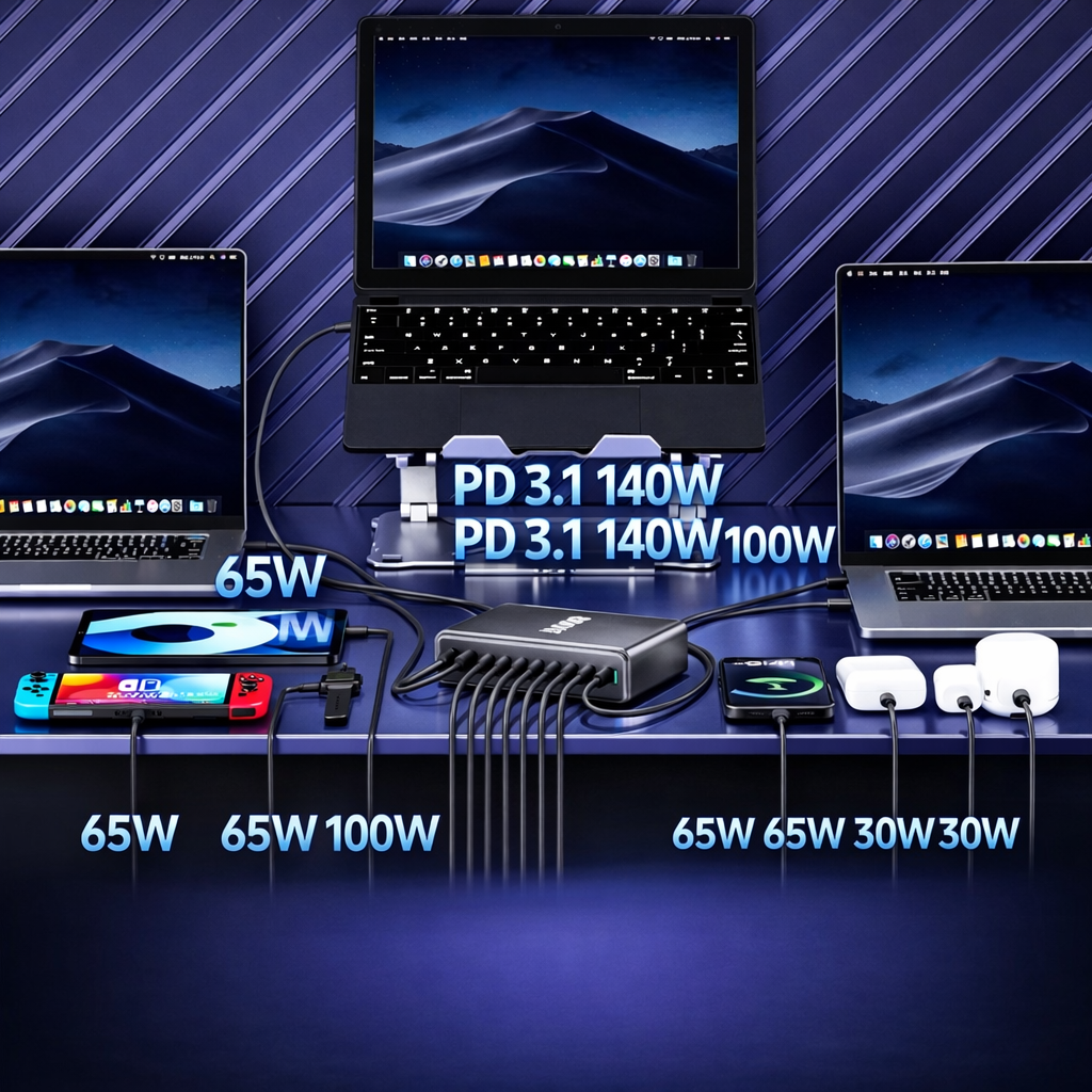 Avec ce chargeur multiport 800W, vous rechargez jusqu'à 10 appareils en même temps sans multiplier les chargeurs ni encombrer votre bureau.